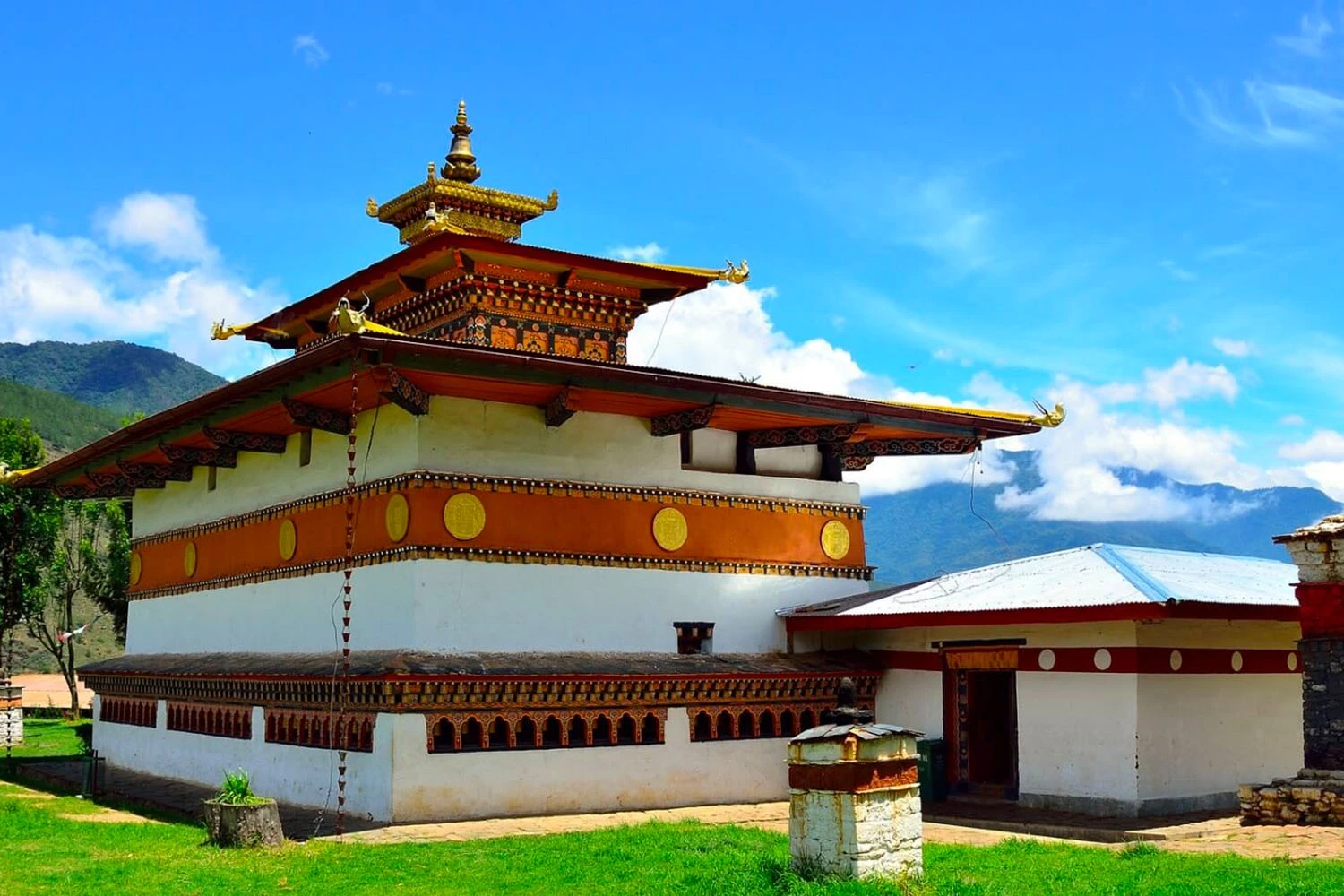 - Kichu Lhakhang – ngôi đền lâu đời nhất Bhutan với kiến trúc độc đáo tạo nên từ 2 ngôi đền “song sinh”. Đây là nơi có cây liễu ngàn năm và cũng là nơi mà Vua và Hoàng Hậu thường xuyên lui tới cầu nguyện cho những chuyến đi xa.